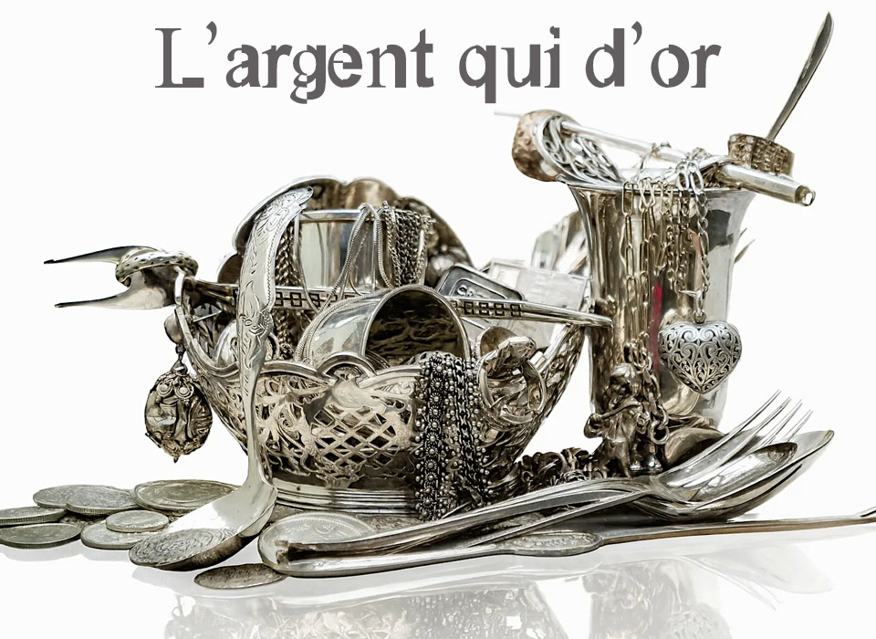 Votre argent (999 ou 925 sterling), bijoux, pièces, objets divers en argent nous intéresse, alors n’hésitez pas à nous les proposer pour profiter de la hausse du marché.